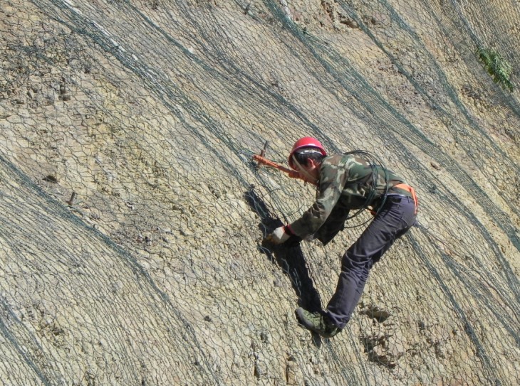 主動(dòng)防護系統是以鋼絲繩網(wǎng)為主的各類(lèi)柔性網(wǎng)覆蓋包裹在所需防護斜坡或巖石上,以限制坡面巖石土體的風(fēng)化剝落或破壞以及為巖崩塌(加固作用),或將落石控制于一定范圍內運動(dòng)(圍護作用)。