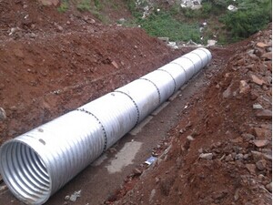 3、鋼制波紋涵管施工時(shí),采用分段施工的方法,預先在原拱涵基底用角鋼并排兩根,長(cháng)度根據涵長(cháng)確定。作鋼質(zhì)涵管推進(jìn)時(shí)的滑軌,波紋涵管管徑根據工程需要可有不同的規格,整裝管管徑為0.5m--2.5m;每節管長(cháng)度3米左右。采用內(外)法蘭螺栓連接。拼裝涵管管管徑為3m--8m。每個(gè)圓周方向有4---15塊板組成,板與板搭接高強螺栓緊固。