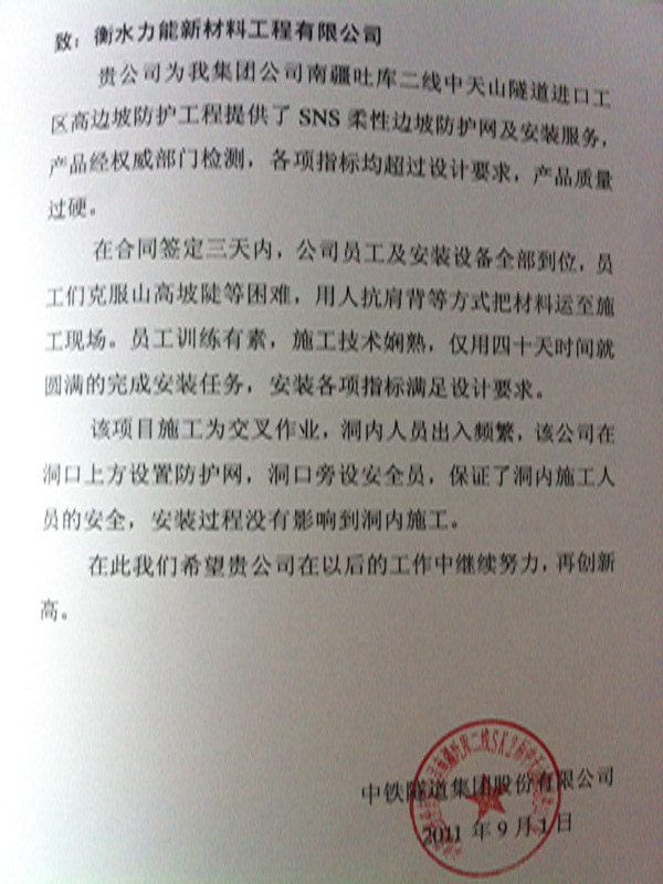 貴公司為我集團公司南疆吐庫二線(xiàn)中天隧道進(jìn)口工區高邊坡防護工程提供了SNS柔性防護網(wǎng)及安裝服務(wù),產(chǎn)品經(jīng)權威部門(mén)檢測,各項指標均超過(guò)設計要求,廠(chǎng)品質(zhì)量過(guò)硬。