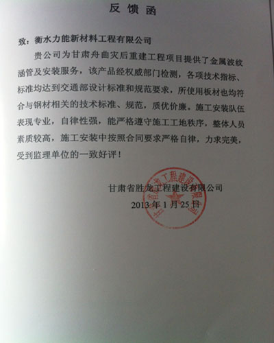 貴公司為甘肅舟曲災后重建工程項目提供了金屬波紋涵管及安裝服務(wù),該產(chǎn)品經(jīng)權威部門(mén)檢測,各項技術(shù)指標,標準均達到交通部設計標準和規范要求,所使用板材也均符合與鋼材相關(guān)的技術(shù)標準,規范,質(zhì)優(yōu)價(jià)廉。施工安裝隊伍表現專(zhuān)業(yè),自律性強,能?chē)栏褡袷厥┕すさ爻绦,整體人員素質(zhì)較高,施工安裝中按照合同要求嚴格自律,力求完美,受到監理單位的一直好評!